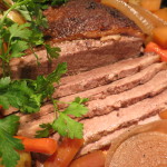 What you serve with your brisket can be as vast as the techniques on how to cook it. This recipe can be adapted to serving it on sandwiches, with those gorgeous roasted onions. Or, it can be a full meal. By adding chunks of boiling potatoes, carrots and rutabaga, 1 ½ hours before the cooking time is finished. Other great compliments are whipped potatoes, buttered noodles or macaroni &