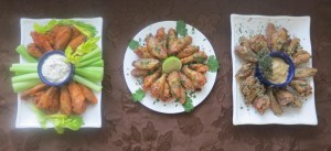Each recipe calls for 2 to 2 ½ lbs. of chicken wings, about 3-4 servings assuming you have lots of other game food. If you have chicken wing fanatics at your party, you may want to double the recipe.