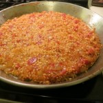 - Add paprika, garlic, bay leaves, tomatoes and onion to pan and cook, stirring often, until onion is softened, about six minutes. Add saffron mixture and broth. Season with salt and bring to a boil over high heat.