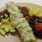 This is a great recipe for avocado lovers. The sauce has a hint of Mexican flavors without being hot. You can use the sauce with salmon, scallops, shrimp, tuna steaks & chicken, as well. To add some color, sprinkle diced tomato over halibut before serving. We served it with black bean salad and organic red quinoa.