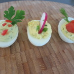 This time of year it seemed inappropriate to call these recipes Deviled Eggs. So, I renamed them Heavenly Eggs, more befitting the spirit of Easter. The cooking term “deviled” actually means to incorporate chopped up food with spicy seasonings or sauces. Seeing I’m not using any mustard (the hot usually referred to in “deviled eggs”) this name seems to work.