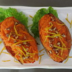 I love twice baked potatoes. They take the whippy loveliness of mashed potatoes and the oven roasted flavor of baked potatoes to create a perfect side dish. So, in this recipe, I took the same concept. It’s a marriage of whipped sweet potatoes with the toasty flavor of roasted sweet potatoes. The maple syrup adds depth and the ginger & orange juice adds a spark. Finished off with roasted pecans brings out toasted flavors. Enjoy!